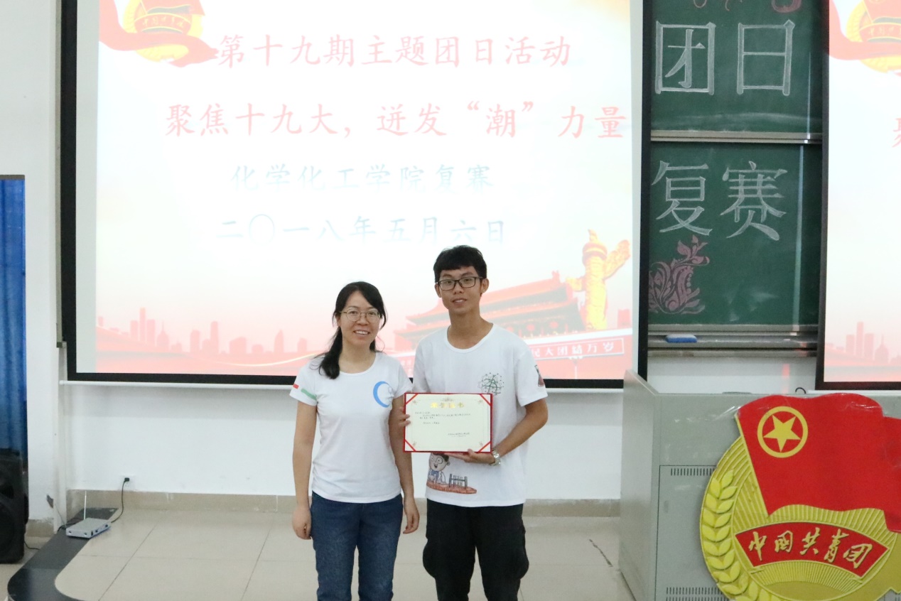 历史新起点,伟大新征程。复赛开始前在座全体师生起立奏唱团歌,接着屏幕播放了各个班的团员心声的视频。每个视频都展现出了优秀团员们有理想,有能力以及有担当的的风采。播放心声视频的环节结束后,比赛正式开始。本次比赛由各班团支部进行PPT演讲、班级表演及班级视频播放,最终评委团会根据各班级的表现进行评分。最先上场的是高分子173,他们以手语表演舞台剧,展示了团支部的风采。随后,应化173、高分子163分别带来深情激昂的朗诵,表现出对未来的浓厚期待与祝福。