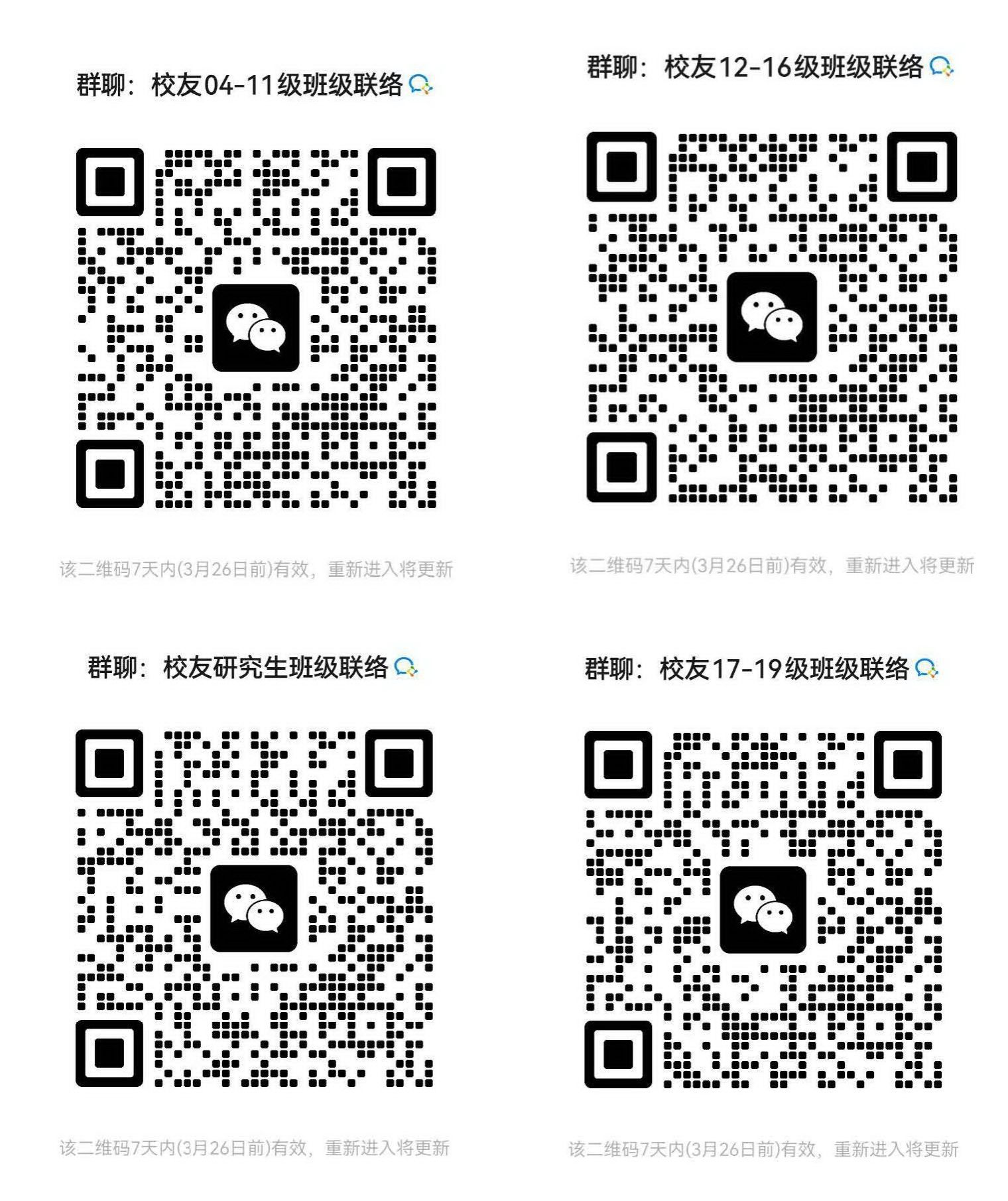 2. 各班级联络员经班级群聊同意,代表本班级实名加入学院对应年级群组的“校友班级对接联络工作”微信群,群组因后续分类工作需要按毕业年级分组设置如图,请务必加入相应群组,入群后请按照“班级名+姓名”备注。